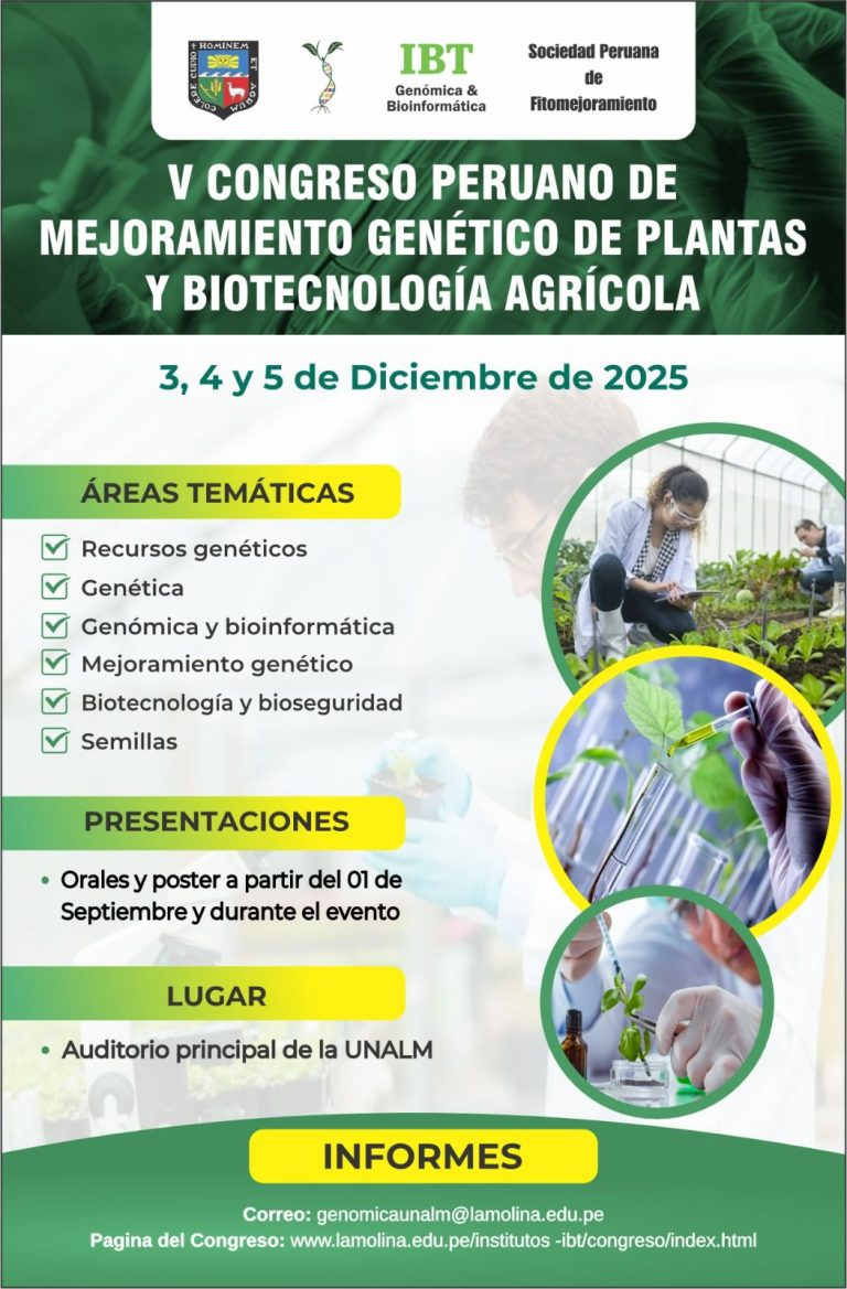 La Universidad Nacional Agraria La Molina se honra el organizar el V Congreso Peruano de Mejoramiento Genético de Plantas y Biotecnología Agrícola a realizarse los días 27, 28, 29 y 30 de abril del 2026 en su campus universitario, ubicado en el distrito de La Molina, en la ciudad de Lima.